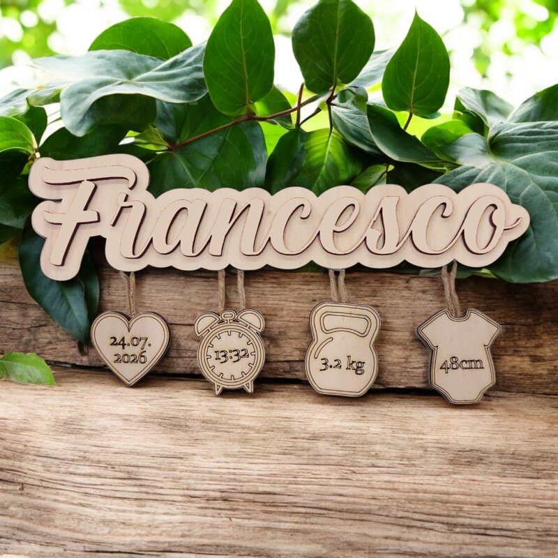Nome con 4 pendagli che indicano: il giorno, il peso, la lunghezza e l'ora della nascita.